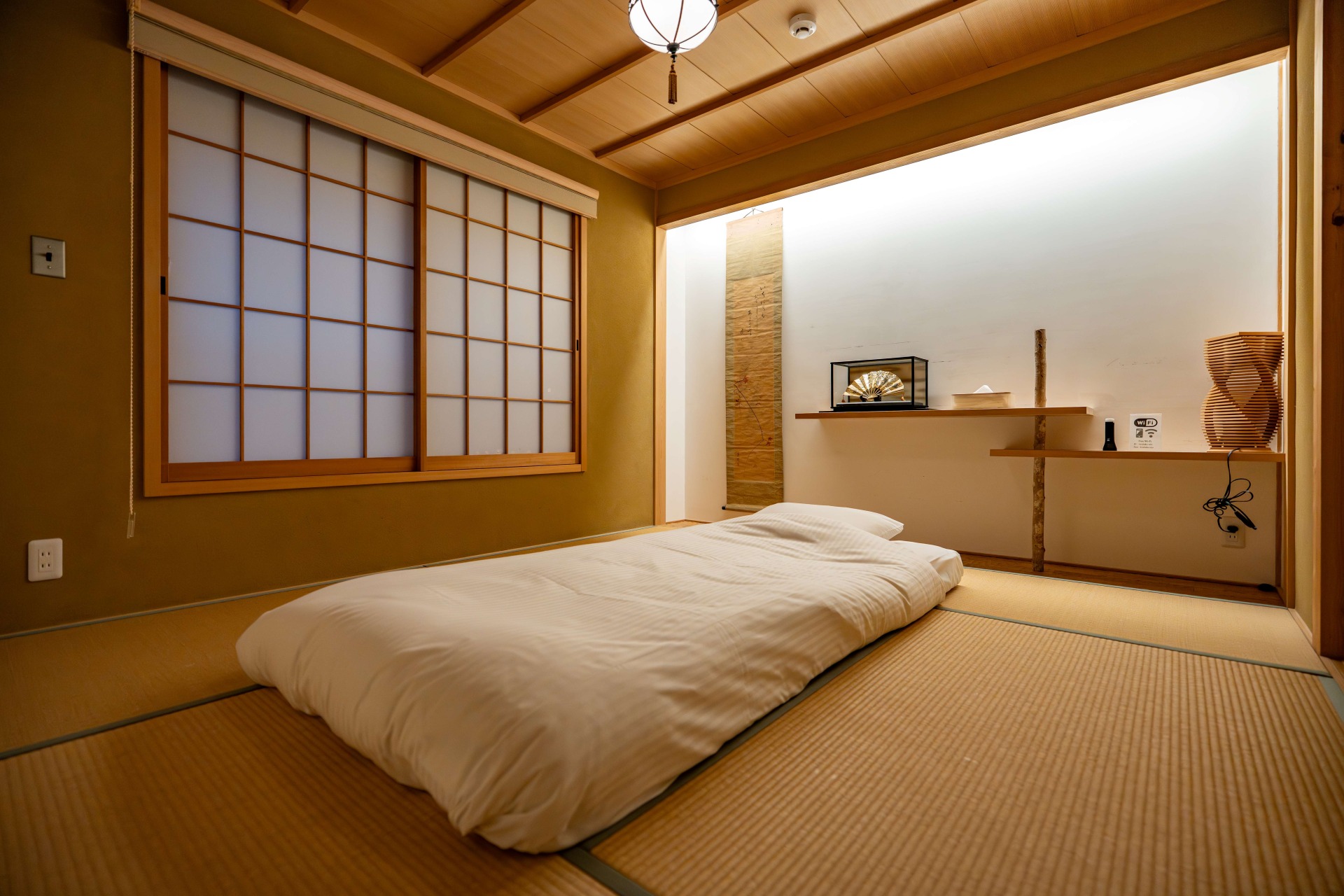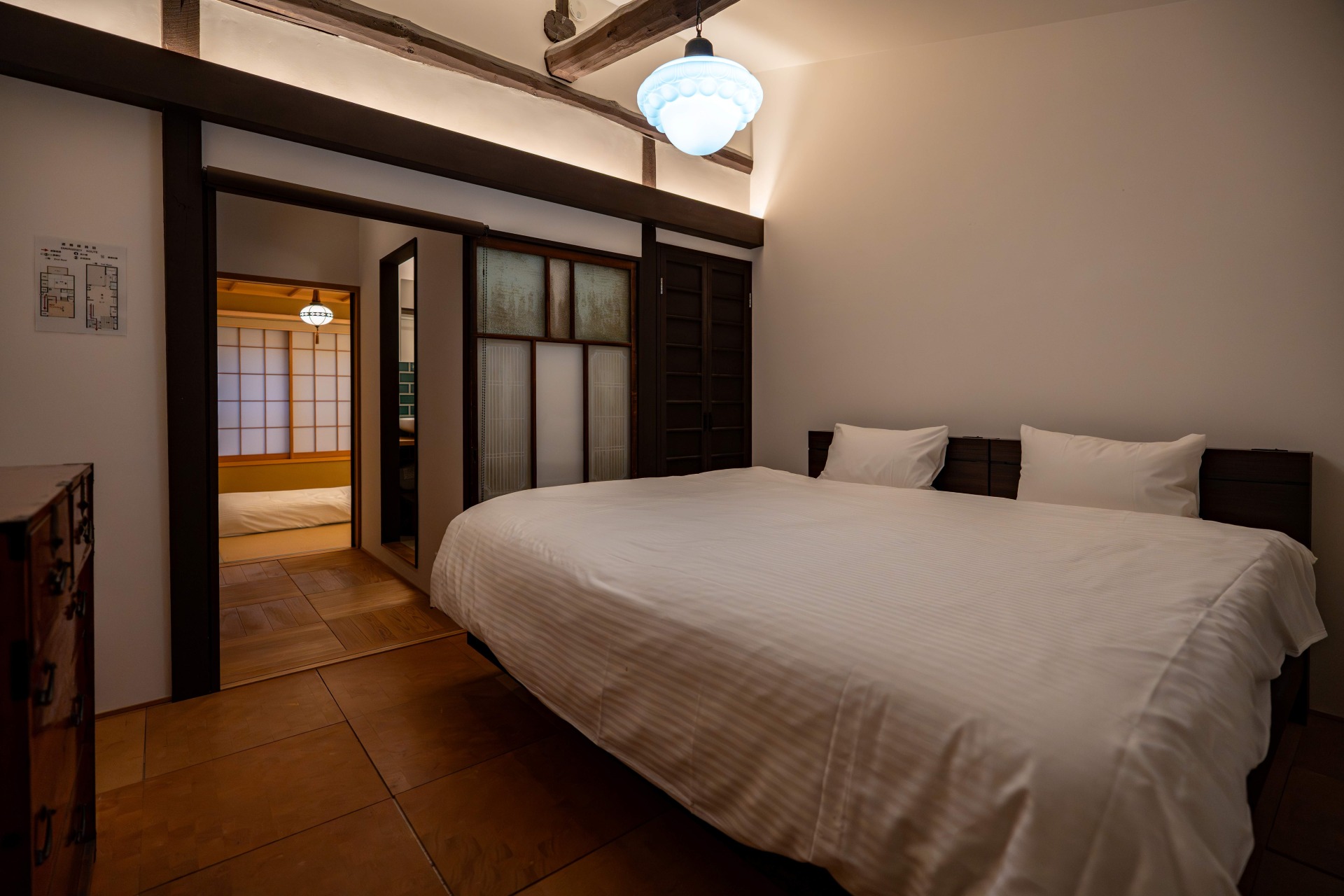| 最大宿泊人数/Max. number of guests 寝具 / Bedding | 最大5人までご宿泊可能。 寝具 ダブルベッド 1台 敷布団 3組(宿泊人数に合わせてご用意します。) ※大人2名以下のご予約の場合、ダブルベッド優先のご利用となります。 ※寝具はご予約人数分のみのご用意となります。 ※敷布団の追加は1組につき3,000円の追加料金にてご用意します。 ご希望の場合は、事前にお問合せください。 ・小学生以上・・・寝具必須:大人と同額(アメニティ・タオル類の準備あり) ・小学生未満・・・添い寝 :無料(アメニティ・タオル類の準備なし) |