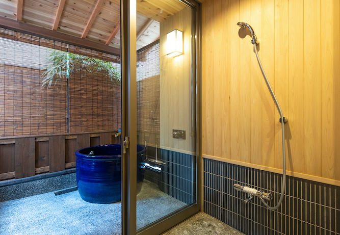 - 1階の浴室は贅沢な信楽焼の露天風呂。お庭を眺めながら、至福のバスタイムをお過ごしいただけます。。