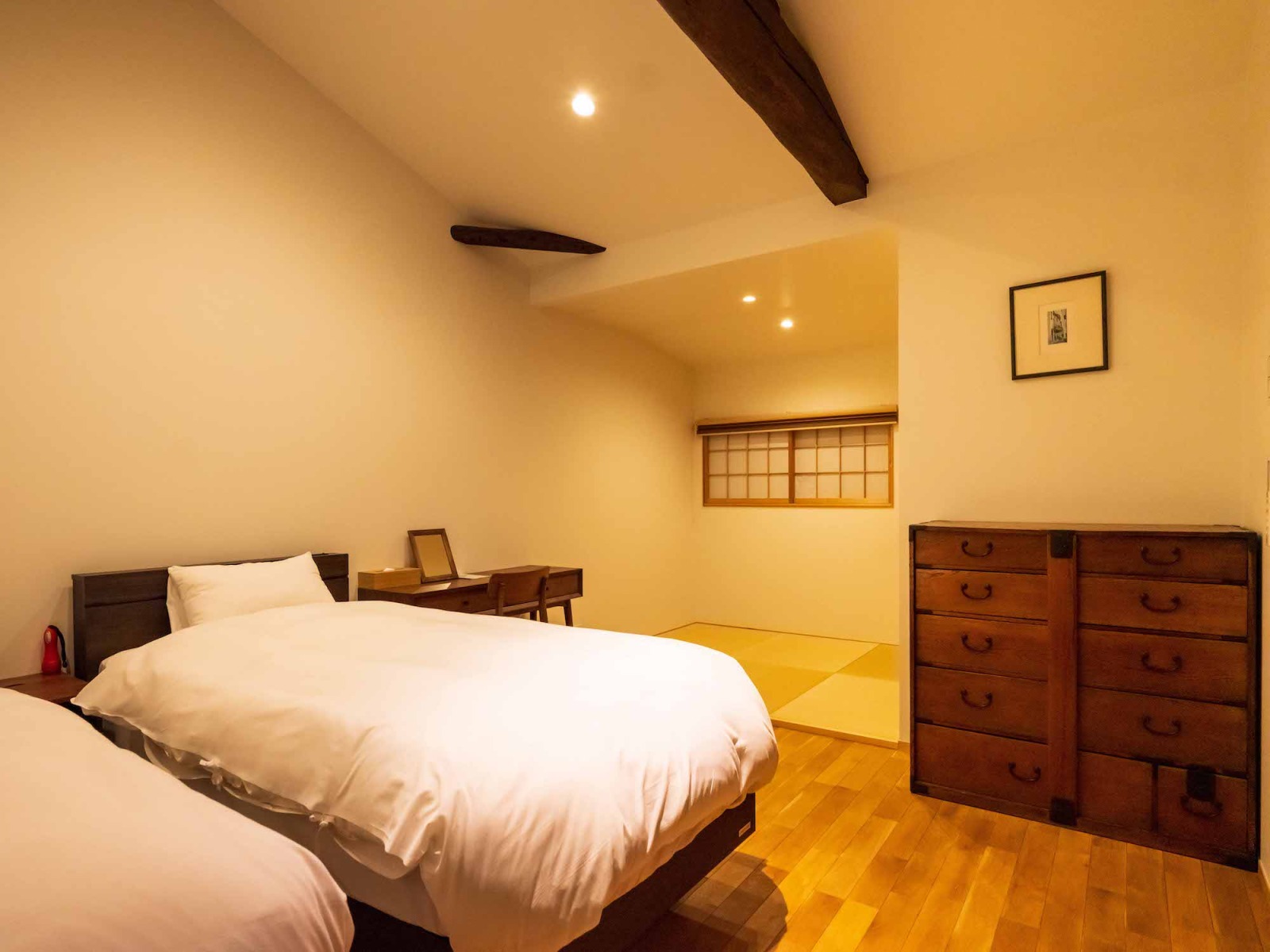 4名様の場合:シングルベッド2台、敷布団2組 etc.敷布団の追加をご希望の場合は、1組につき3,000円にてご用意いたします。