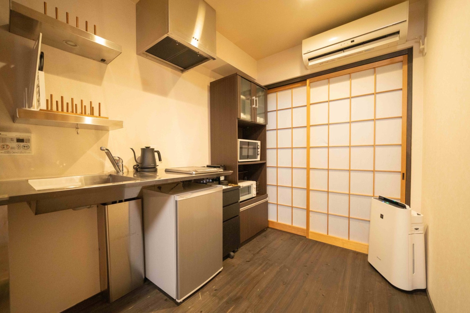 - キッチンには必要な調理器具や食器類をご用意しておりますので、お宿内でお食事をお楽しみいただけます。